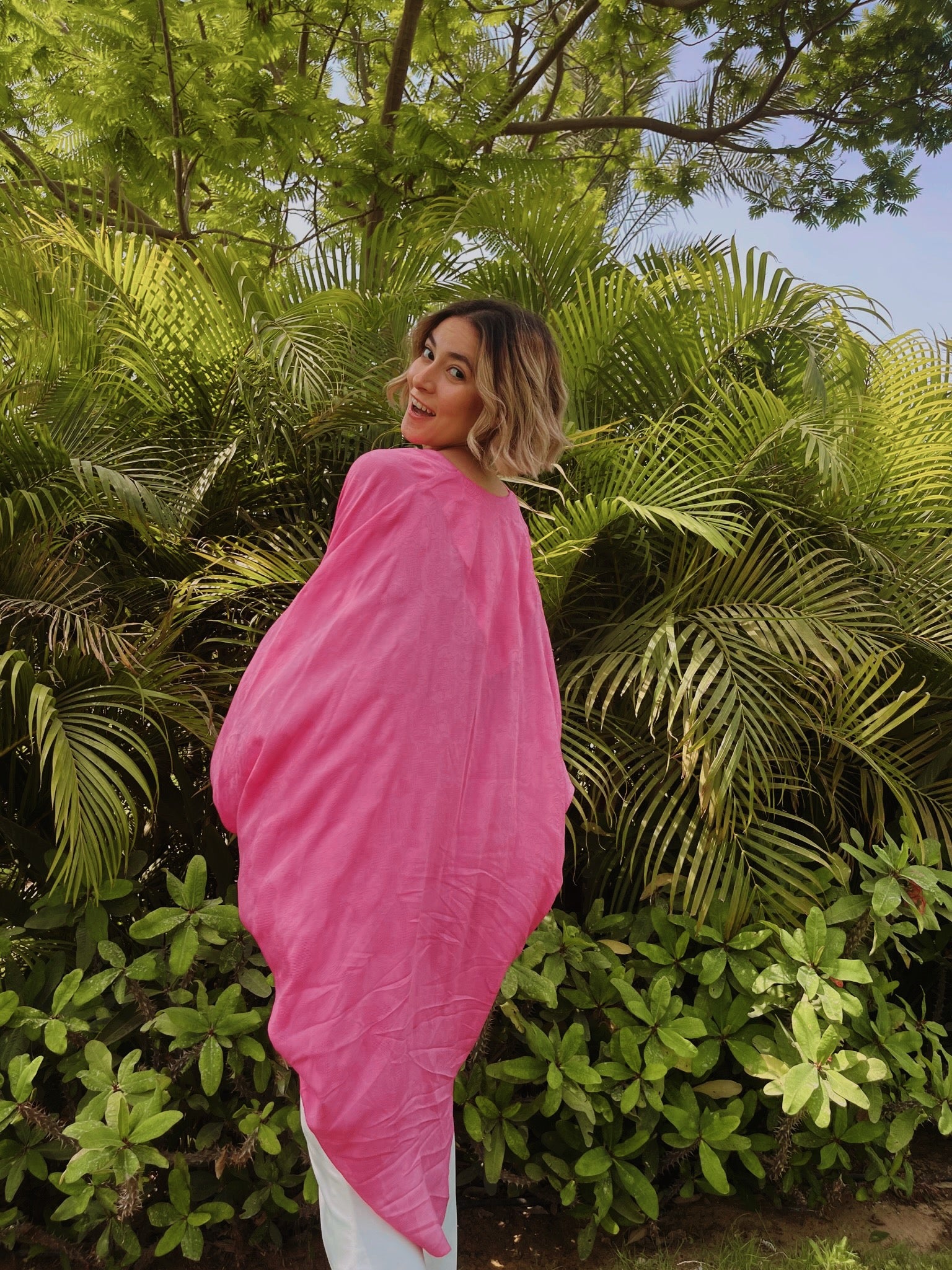 Light linen high-low top with simple fleuri weaving details in the fabric itself.