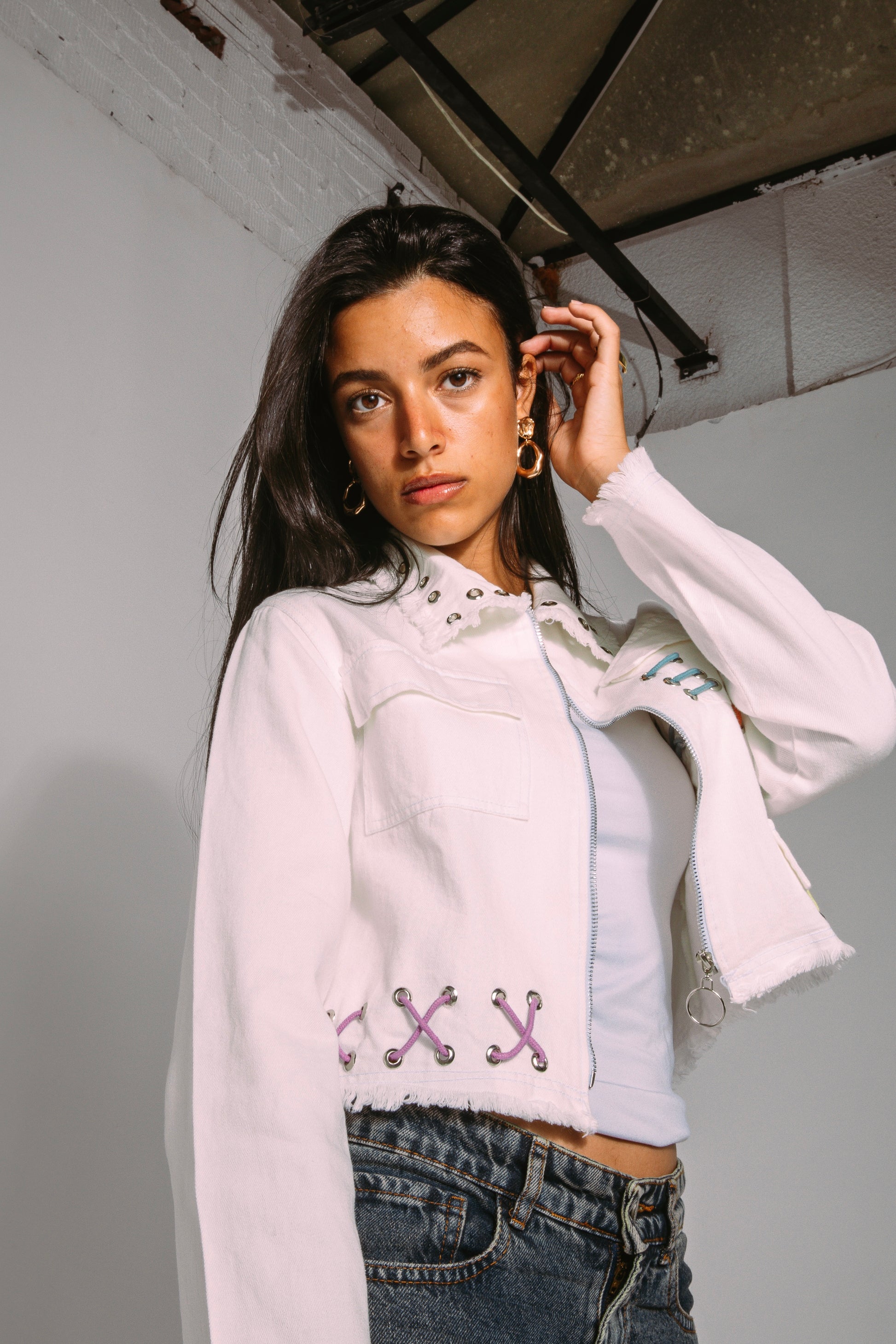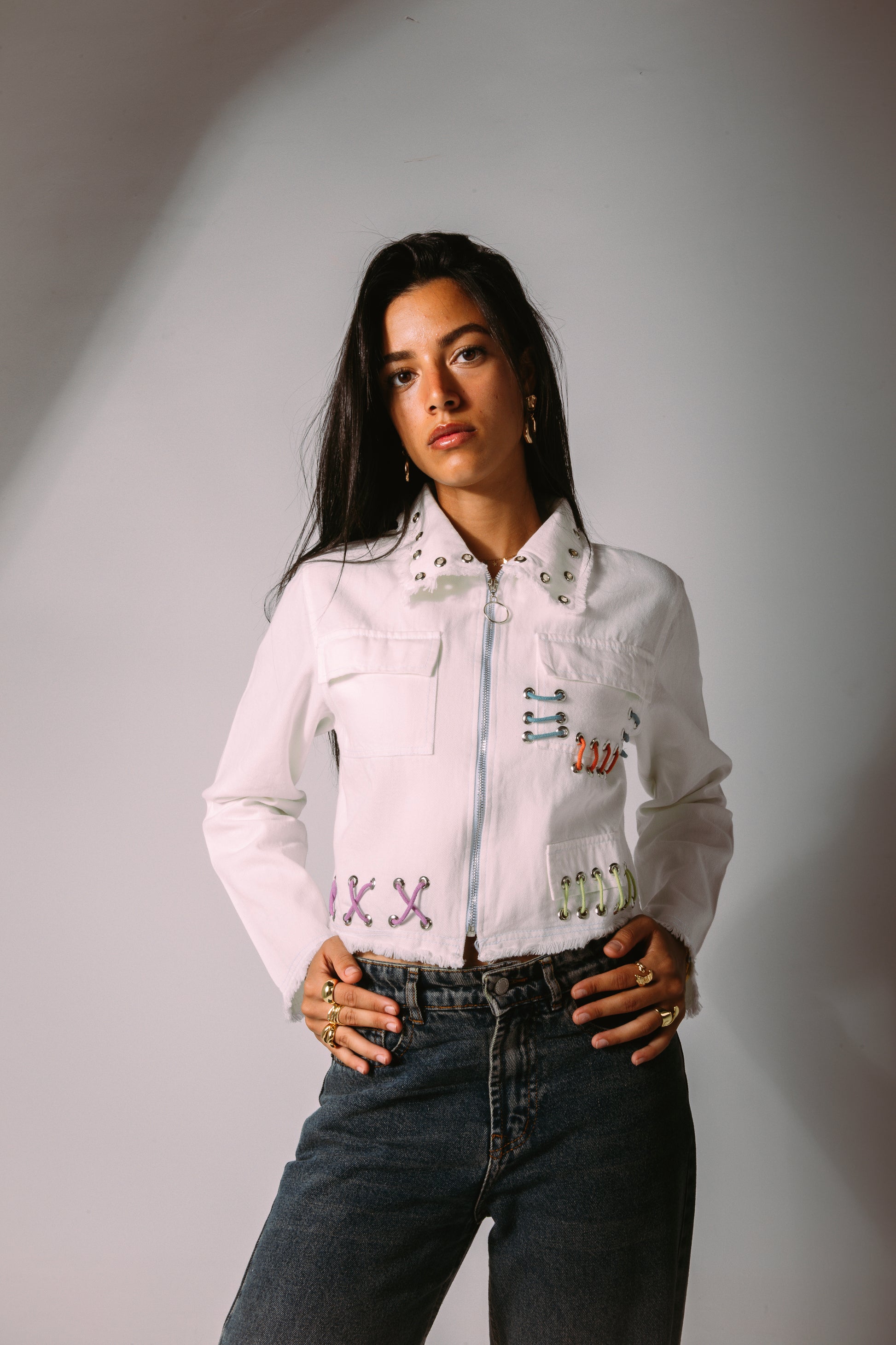cropped white denim jacket with fringy edges and Multi-color ropes that make it match with colored pants or a basic jeans